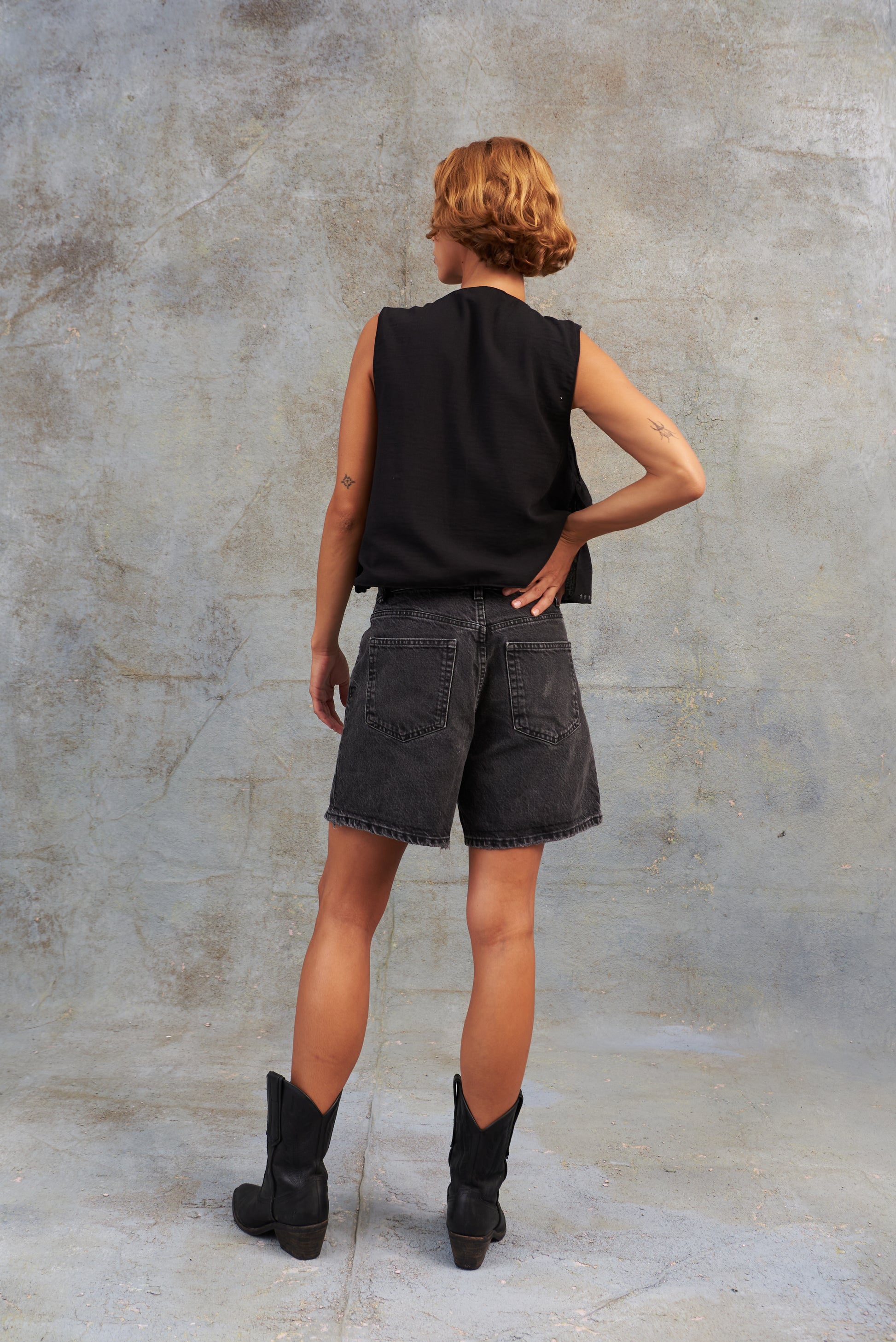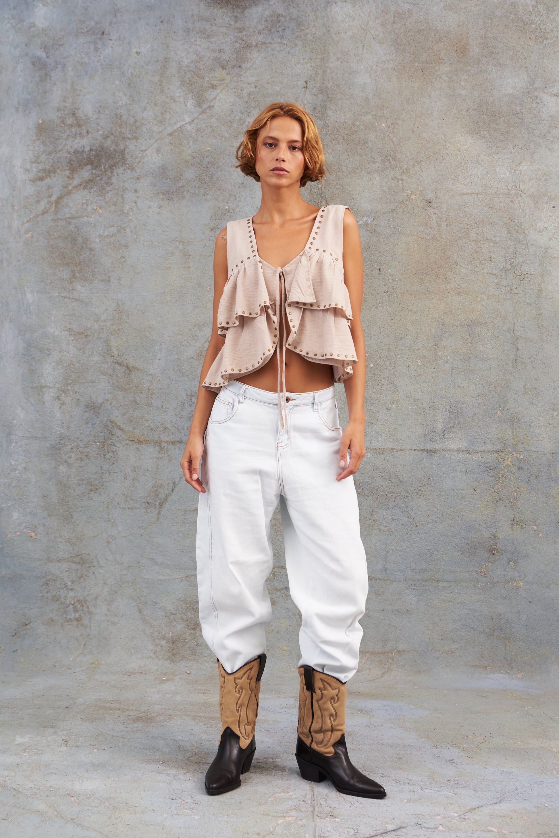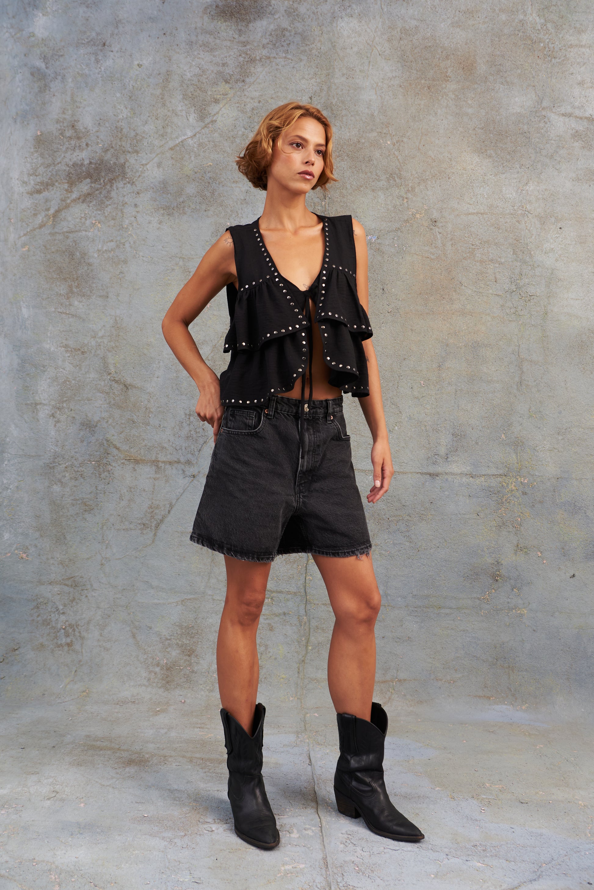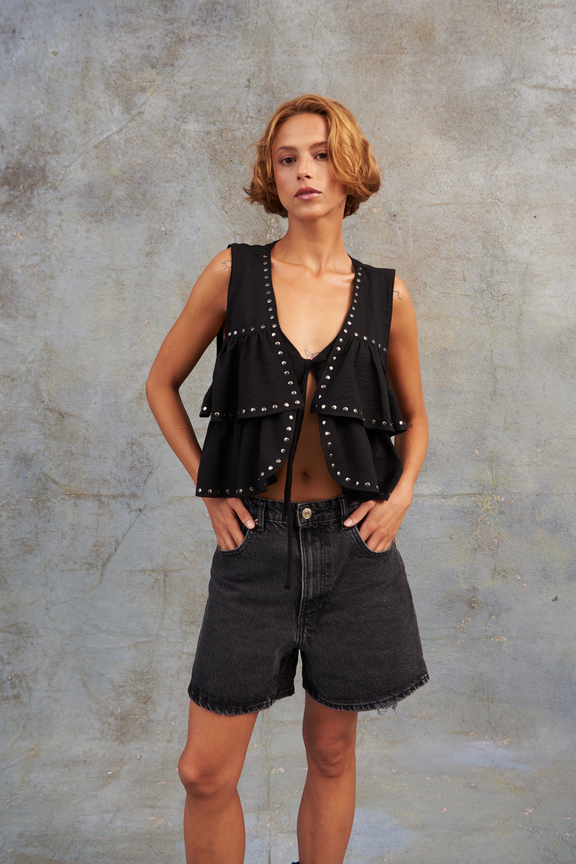 Volumen, textura y actitud. Un chaleco con caída fluida, detalles metálicos y silueta abierta.